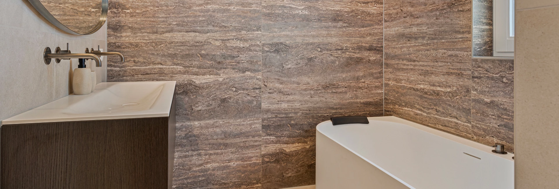 Ontdek de moderne badkamer met grote tegels in steenlook, die de ruimte een eigentijdse uitstraling geven. Het halfvrijstaande bad voegt een gevoel van ruimte toe, terwijl het luxe badmeubel met twee kranen een verfijnde en praktische afwerking biedt.