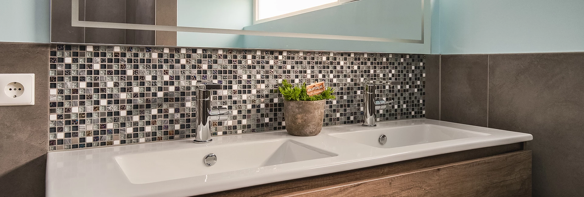 Het meest opvallend in deze moderne badkamer is het gebruik van de gekleurde mozaïek tegels. Dat lijkt een gewaagde keuze. Maar als je verder voor rustige tinten kiest - zoals hier is gebeurd - blijft de harmonie bewaard. De gekleurde tegels geven juist een vrolijke, hippe sfeer aan de badkamer. En dat was precies waar dit gezin naar op zoek was.